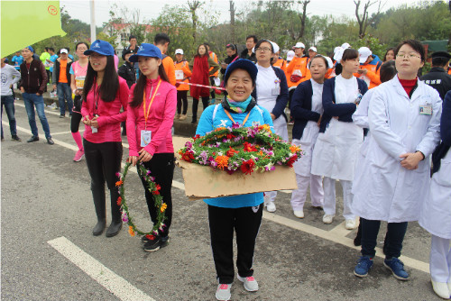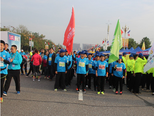 紅旗招展,彩旗飄飄,集團公司60人健康跑隊伍浩浩蕩蕩邁入前方檢錄點