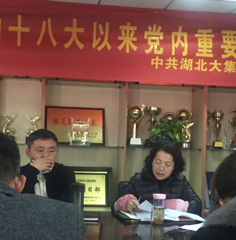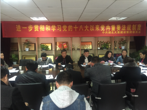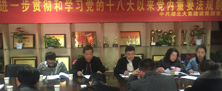 為了深入貫徹落實黨的十八屆六中全會精神,增加思想政治教育,加強黨的知識普及,2016年11月21日下午,湖北大集建設(shè)集團黨委組織全體黨員同志在集團會議室集中學(xué)習(xí)《中國共產(chǎn)黨章程》、《中國共產(chǎn)黨廉潔自律準(zhǔn)則》、《關(guān)于新形勢下黨內(nèi)政治生活的若干準(zhǔn)則》、《中國共產(chǎn)黨紀(jì)律處分條例》等黨內(nèi)文件和重要法規(guī)制度。