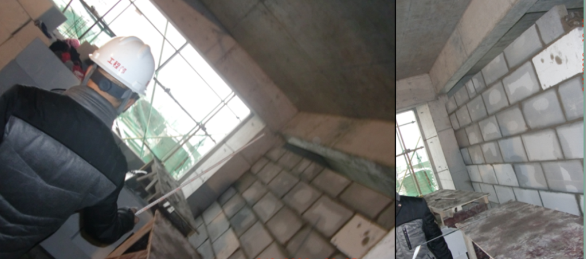 邁入三樓,王工更是拿出尺子,用精細(xì)的數(shù)據(jù)去檢驗(yàn)工程的品質(zhì),他仔細(xì)測(cè)量了磚砌體頂部斜砌留置位置的大小,角度,認(rèn)真向大家介紹了磚砌體施工要求以及不規(guī)范施工帶來(lái)的后果,并對(duì)16號(hào)樓規(guī)范的磚砌體作業(yè)予以高度評(píng)價(jià),16號(hào)樓磚砌體灰縫均勻、順直、密實(shí),基礎(chǔ)處理較好;拖墻筋植筋合規(guī);頂部斜砌留置合規(guī);墻體觀感度良好,整體質(zhì)量?jī)?yōu)良!