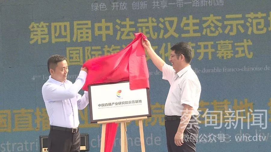 市政府副秘書長(zhǎng)雷勇生與武漢閱景匯發(fā)展有限公司董事長(zhǎng)徐濤為“中國(guó)直播產(chǎn)業(yè)研究院示范基地”揭牌。
