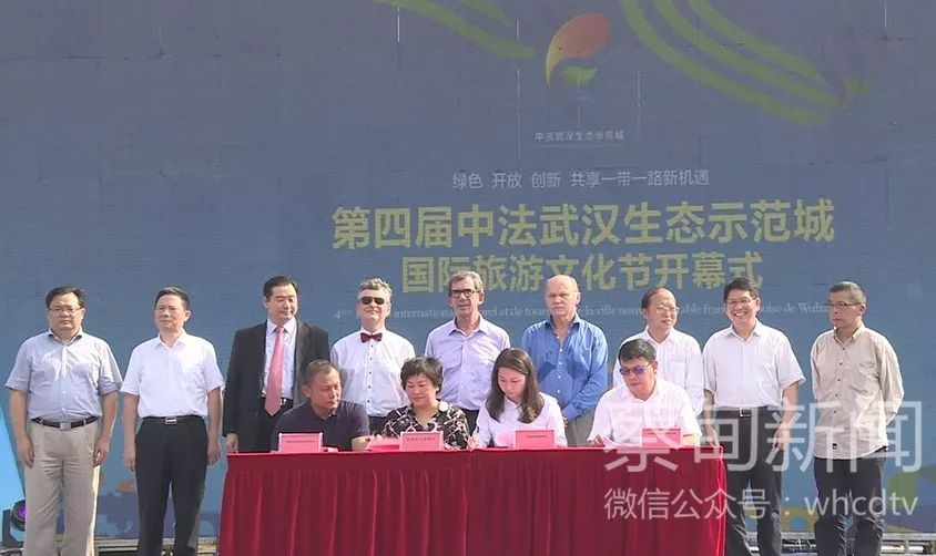 蔡甸區(qū)區(qū)長(zhǎng)彭巧娣與法國(guó)法中之家旅行集團(tuán)、武漢朝宗文化旅游有限公司以及湖北中競(jìng)體育文化傳播有限公司簽訂合作協(xié)議。