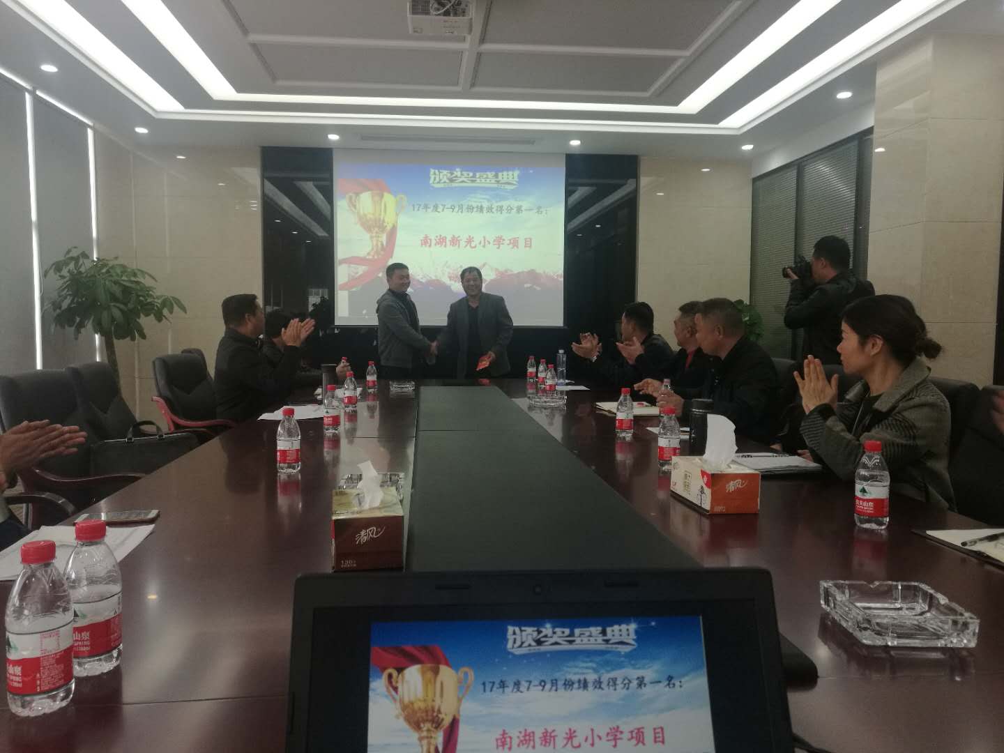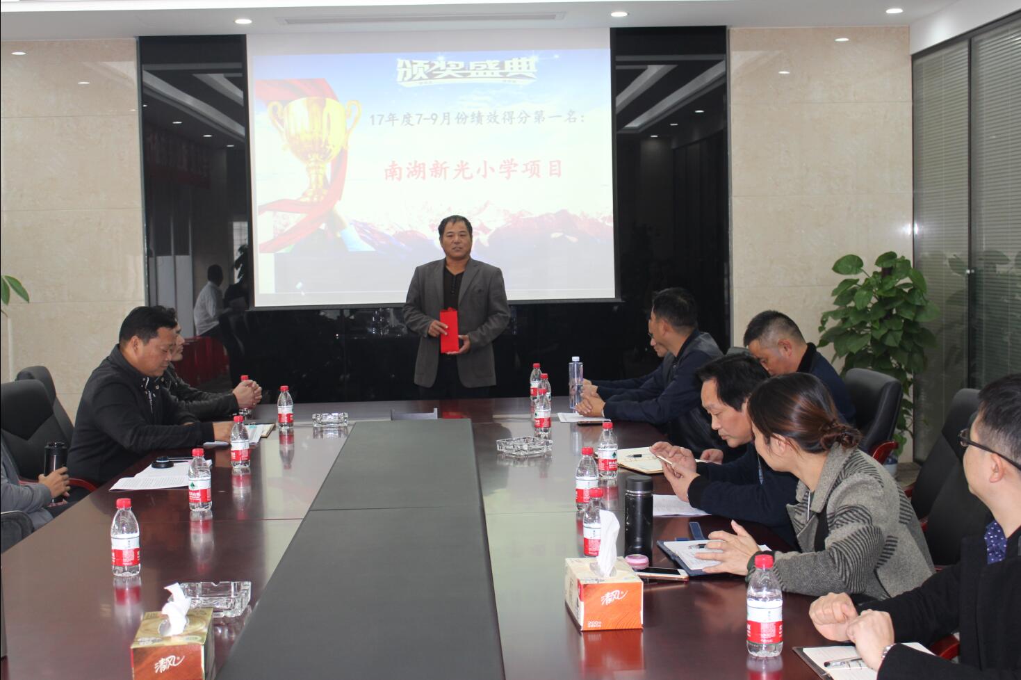 會(huì)議開(kāi)始,由人事行政部公布了上季度績(jī)效考評(píng)中的冠軍項(xiàng)目——南湖(新光)小學(xué)項(xiàng)目,并由董事長(zhǎng)徐濤向冠軍項(xiàng)目頒發(fā)10000元獎(jiǎng)金!