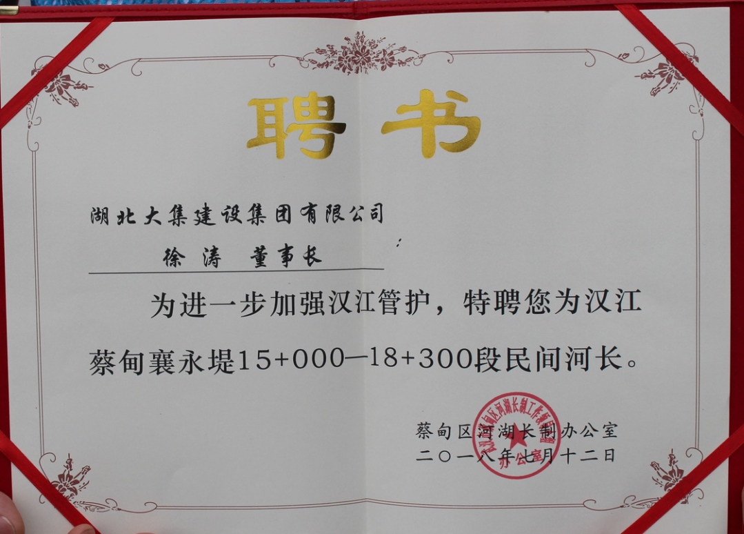 水是生命之源、生產(chǎn)之要、生態(tài)之基。為貫徹落實(shí)習(xí)近平總書記視察湖北的重要講話精神,進(jìn)一步加強(qiáng)河湖管理和保護(hù)工作,7月12日,蔡甸區(qū)漢江民間(企業(yè))河長履職啟動(dòng)儀式于蔡甸區(qū)江灘公園隆重舉行,湖北大集建設(shè)集團(tuán)董事長徐濤受聘為漢江蔡甸襄永堤15+000—18+300段民間河長。