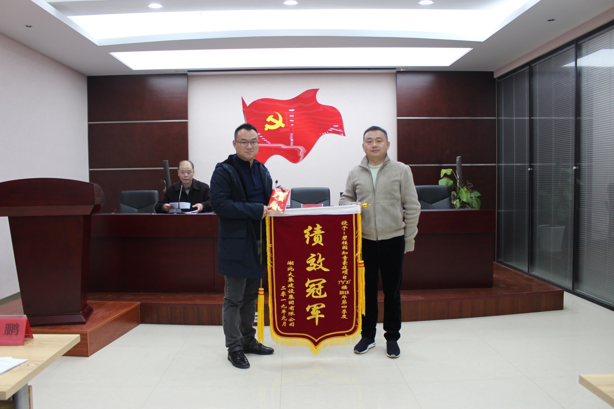 會議開始,集團(tuán)董事長徐濤為2018年第四季度項(xiàng)目績效冠軍——碧桂園知音豪庭7、9、10#頒發(fā)錦旗和獎金。