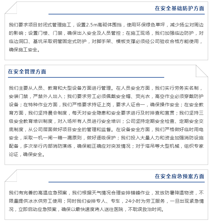 抓工程技術(shù),必須一絲不茍;抓工程進度,必須一天不讓;抓工程質(zhì)量,必須一點情面不講;抓工程安全,必須一刻也不放松。這四個必須是集團公司精益求精、鑄造精品的法寶。未來,集團公司將繼續(xù)將安全作為警鐘紅線,將品質(zhì)作為立業(yè)之本,全力做好每一個工程項目!