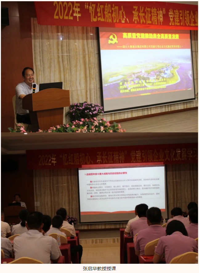 接著,湖北省委講師團基層理論宣講員張啟華教授以“高質量黨建推動企業(yè)高質量發(fā)展”為主題進行授課。張教授從“苦難與輝煌”、“消失與崛起”、“巨變與挑戰(zhàn)”、“經(jīng)驗與啟示”、“輝煌與蝶變”五個方面分別講述了中國共產(chǎn)黨的百年奮斗史、跌宕起伏中國房企十年之變、房企掌舵者眼中的2022年、紐約灣區(qū)發(fā)展成為世界級灣區(qū)的原因以及高科技贏在新時代的內(nèi)容,并在講解中融入了湖北大集建設集團和武漢閱景匯兩家公司的發(fā)展歷程,讓大家對中國共產(chǎn)黨的發(fā)展、公司的發(fā)展以及個人的發(fā)展有了更加清晰的認識以及深刻的反思。