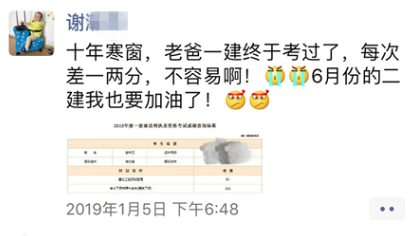 1月5日,2018年度一級(jí)建造師考試可以查成績(jī)了。管理81,實(shí)務(wù)101,謝守衛(wèi)在連續(xù)兩個(gè)考試年度內(nèi)通過(guò)了全部應(yīng)試科目,從2009年到2018年,他堅(jiān)持十年,終于拿下了一級(jí)建造師資格證!