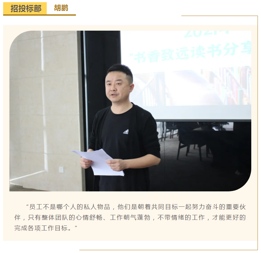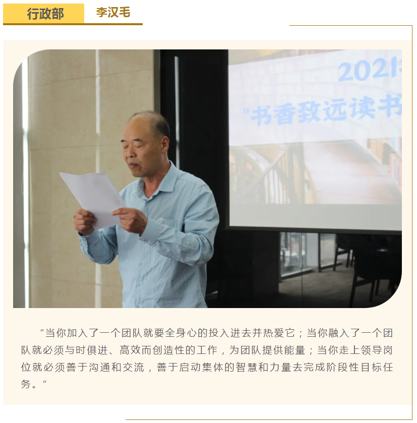 此次中高層領(lǐng)導(dǎo)共讀并分享的書籍是《麥肯錫團(tuán)隊(duì)管理法》,集團(tuán)公司七位部門負(fù)責(zé)人依次上臺(tái),結(jié)合各自的實(shí)際工作、管理經(jīng)驗(yàn)等,對(duì)書中的觀點(diǎn)進(jìn)行闡述與分析。在思想交流碰撞中,各位部門負(fù)責(zé)人進(jìn)一步加深了對(duì)團(tuán)隊(duì)管理的認(rèn)識(shí),反思了自己在部門管理中存在的問題,了解了更多的管理細(xì)節(jié),學(xué)習(xí)了更有效的管理方法,為今后更好地完成日常管理工作打下了堅(jiān)實(shí)的基礎(chǔ)。