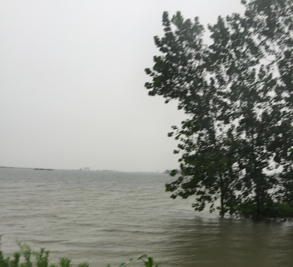 車子行駛在大堤上,隨處可見紅旗招展,黨旗迎風(fēng)飄揚,隔段就有帳篷拉起來的簡陋住所。這里的田疇已經(jīng)完全泡在水里,稻谷和高梁果樹已浸泡得不成樣子。大堤上雖然不知道有多少人筑守在這里,一路行駛中到處可以看到分村分段守護的標牌矗立著。