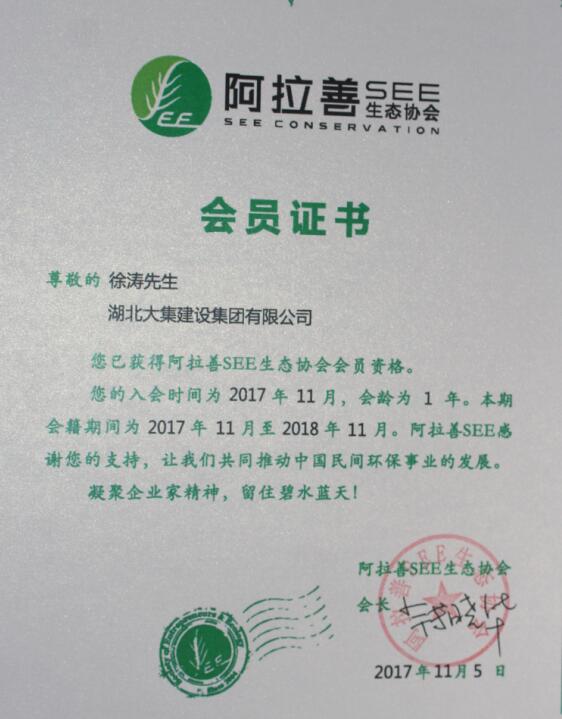 2017年11月,集團(tuán)董事長徐濤攜湖北大集建設(shè)集團(tuán)加入阿拉善SEE生態(tài)協(xié)會,正式成為阿拉善SEE會員,與各界熱心環(huán)保的社會人士共同推動民間環(huán)保事業(yè)的發(fā)展,努力為阿拉善沙漠筑起最美的防護(hù)墻!