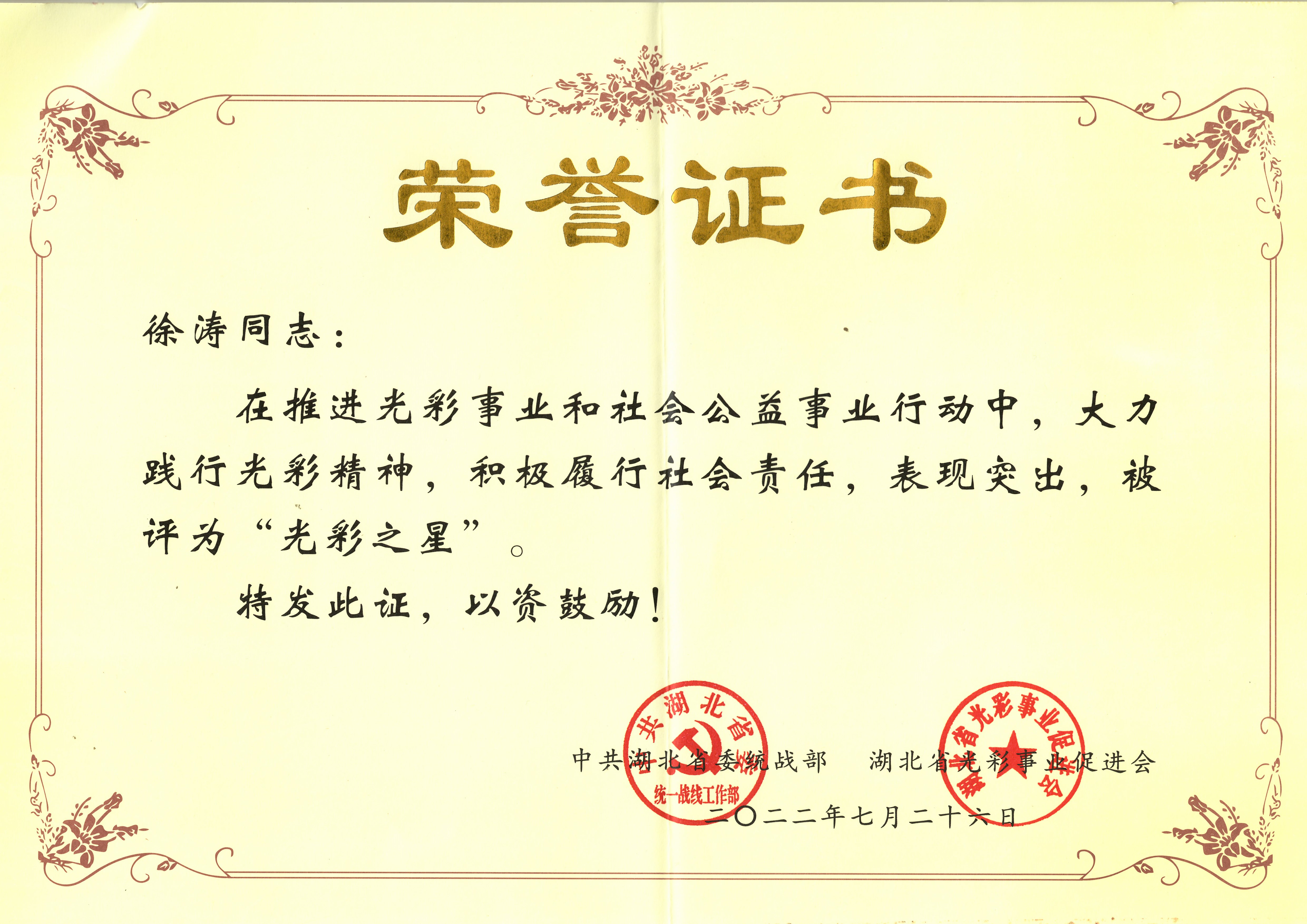 近日,由中共湖北省委統(tǒng)戰(zhàn)部、省光彩事業(yè)促進(jìn)會共同評選60名民營經(jīng)濟(jì)人士“光彩之星”表彰會在恩施召開。會議表彰了一批熱心公益事業(yè)、積極回報(bào)社會的優(yōu)秀非公有制經(jīng)濟(jì)人士,湖北大集建設(shè)集團(tuán)有限公司董事長、武漢閱景匯投資發(fā)展有限公司董事長徐濤榮獲全省“光彩之星”榮譽(yù)稱號!